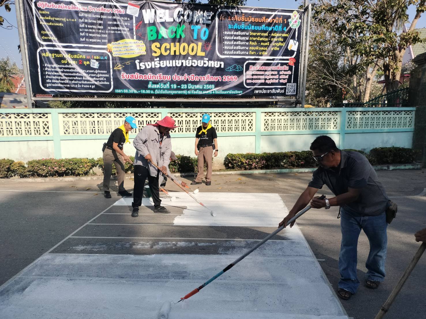ได้ร่วมกันทำกิจกรรมจิตอาสาพัฒนา ทาสีตีเส้นทางข้าม(ทางม้าลาย) บริเวณหน้าโรงเรียนเขาย้อยวิทยา พร้อมคณะครูโรงเรียนเขาย้อยวิทยา