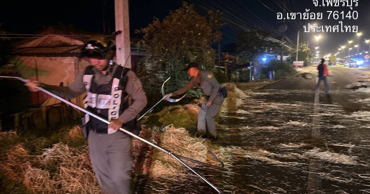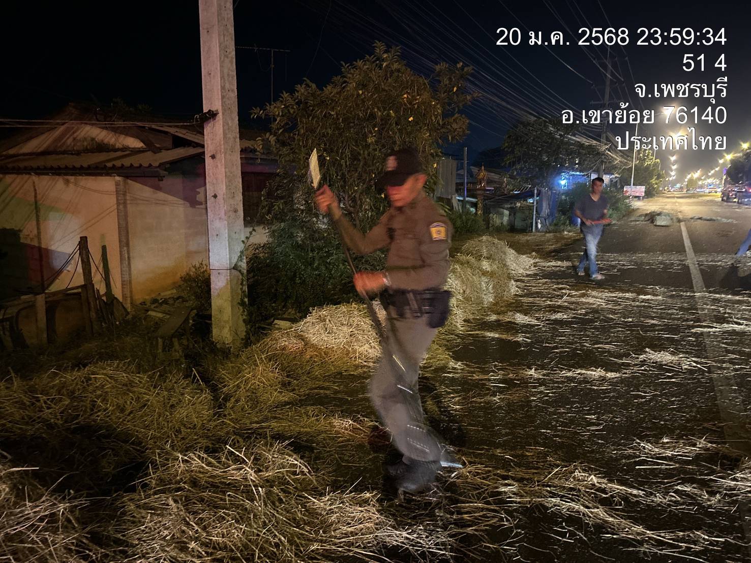 ก้อนฟางตกหล่นกีดขวางการจราจร 20 มกราคม 2568 โดย adm_khaoyoi adm_khaoyoi / งานจราจร,งานป้องกันปราบปราม วันที่ 20 ม.ค. 68 เวลา 23.41 น. รับแจ้งปัญหาจราจรา ขาล่องใต้ ก่อนถึงศาลเจ้าแม่เขาย้อย ทำก้อนฟางตกหล่นกีดขวางการจราจร แจ้งไปยัง ร้อยเวร 2-0 ร.ต.อ.พรนรินทร์ จันทร์มณี พร้อม สายตรวจรถยนต์201 และ จยย.1211 ว.4 ดำเนินการ นำก้อนฝางดังกล่าวออกจาก ถนนเพื่อให้สามารถสัญจรได้