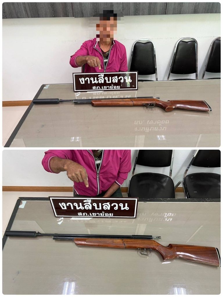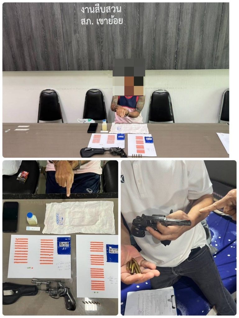 2.อาวุธปืนพกสั้นแบบรีวอลเวอร์ ขนาด .22 นิ้ว มีเครื่องหมายทะเบียนปืน จำนวน 1 กระบอก
