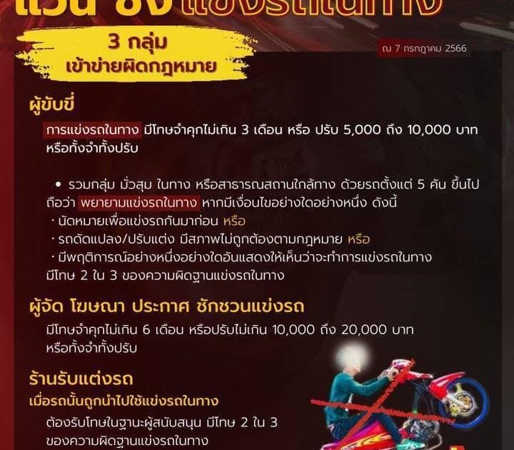 • การแข่งรถในทาง มีโทษจำคุกไม่เกิน 3 เดือน หรือปรับ 5,000 – 10,000 บาท หรือทั้งจำทั้งปรับ