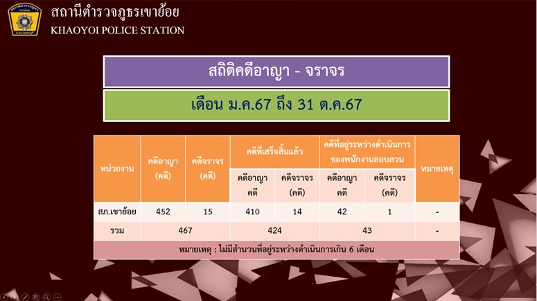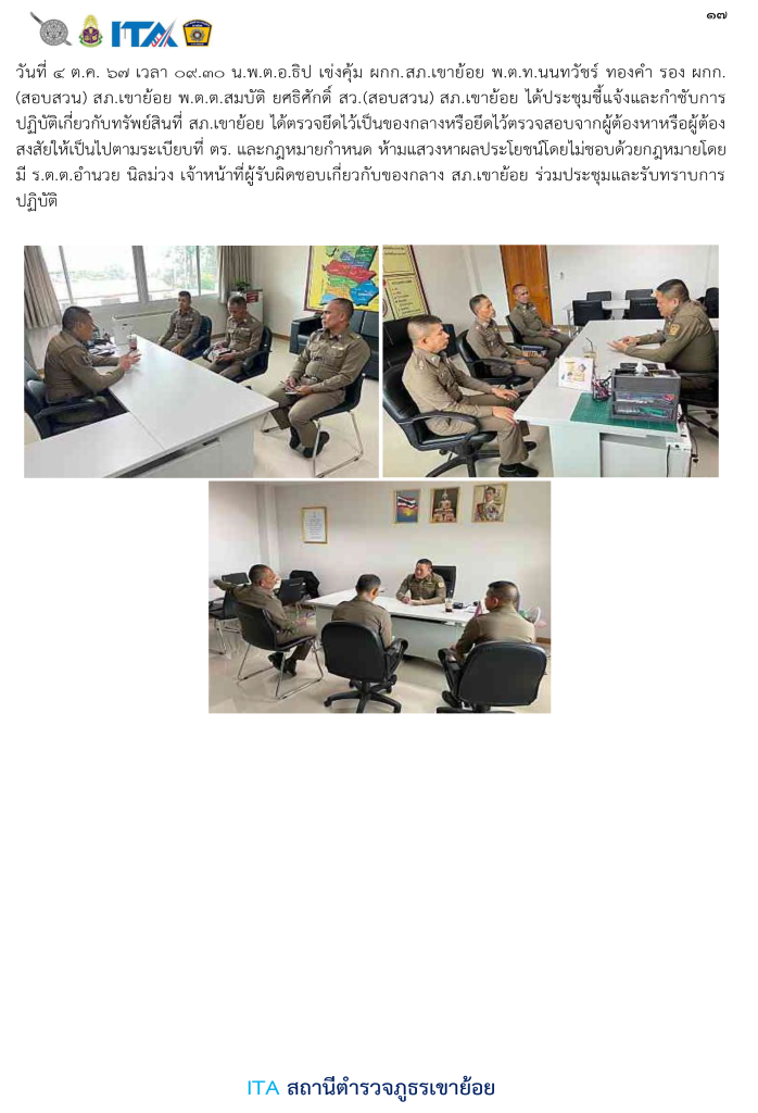 ประชุมชี้แจ้งและกำชับการปฏิบัติเกี่ยวกับทรัพย์สินที่ สภ.เขาย้อย ได้ตรวจยึดไว้เป็นของกลางหรือยึดไว้ตรวจสอบจากผู้ต้องหาหรือผู้ต้องสงสัยให้เป็นไปตามระเบียบที่ ตร. และกฎหมายกำหนด