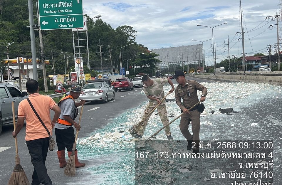 วันที่ 2 มิ.ย. 2568 เวลา 08.56 น. ศูนย์รับแจ้งเหตุ ฉุกเฉิน 191 เพชรบุรี ได้รับแจ้งมีเหตุปัญหาจราจร รถบรรทุกทำกระจกตกหล่นบนถนน บริเวณแยกเขาย้อย ถ.เพชรเกษม ขาล่องใต้ จึงได้สั่งการ สภ.เขาย้อย ให้ สายตรวจเขาย้อย 60 ตรวจสอบและประสานเจ้าหน้าที่กรมทางฯ มาทำความสะอาดและเก็บกวาดเศษกระจกต่อไป