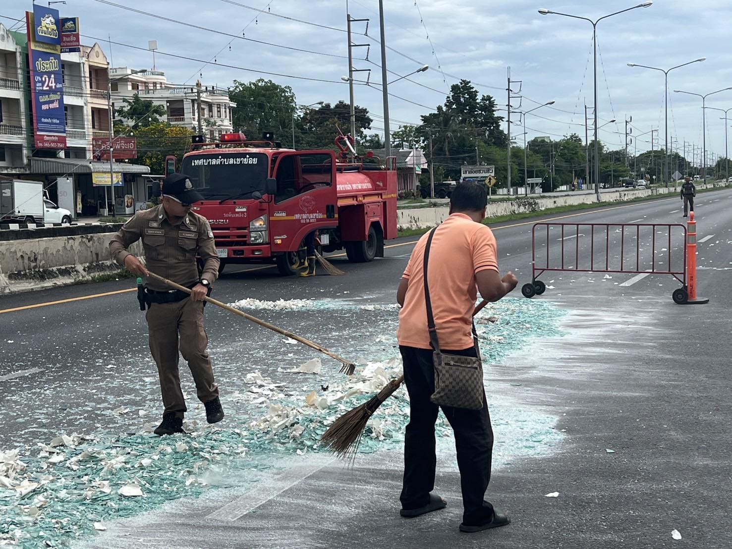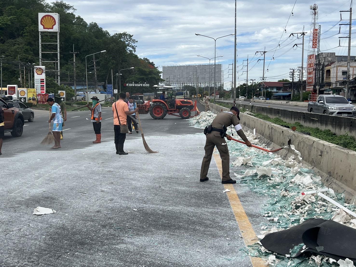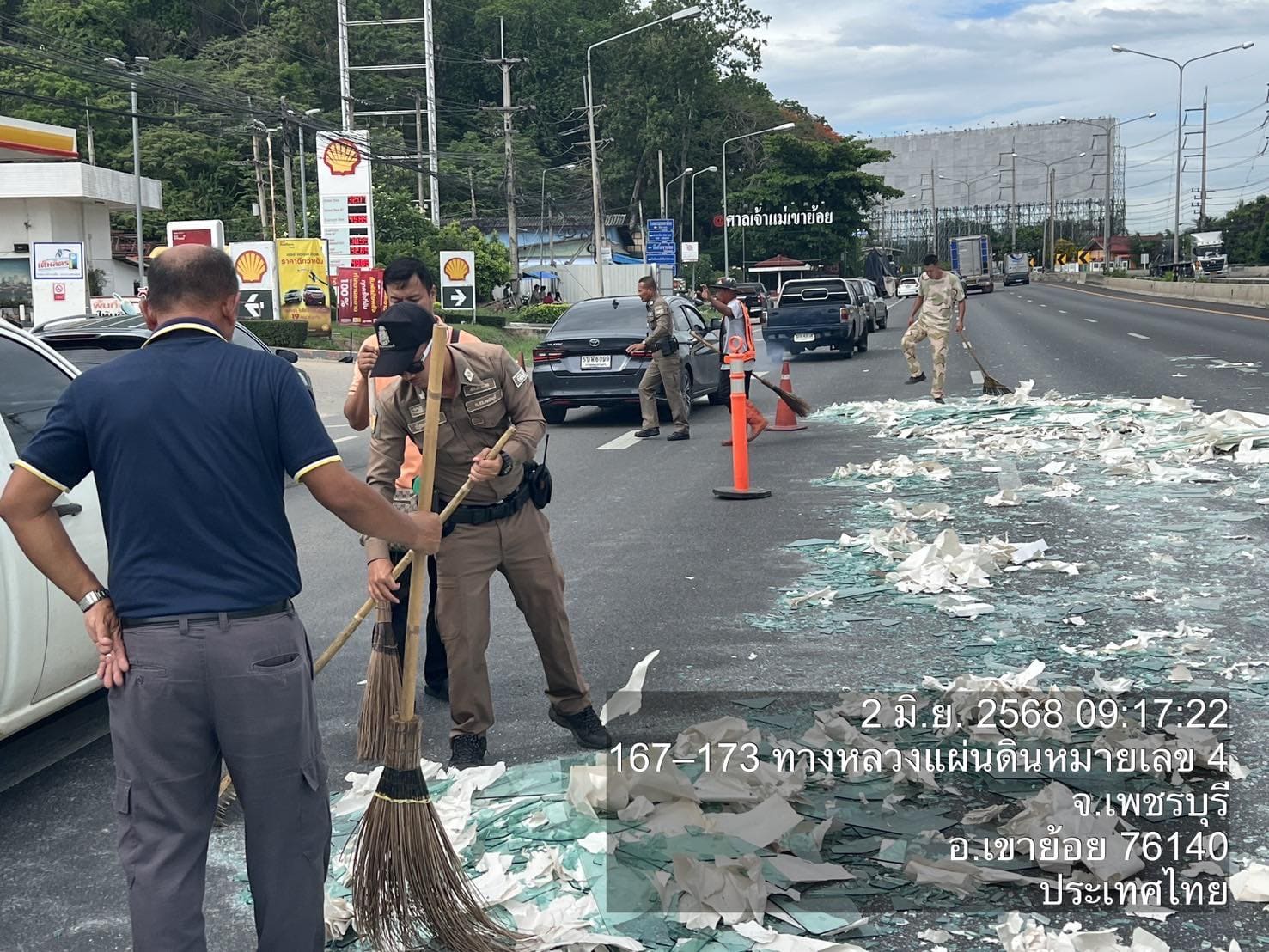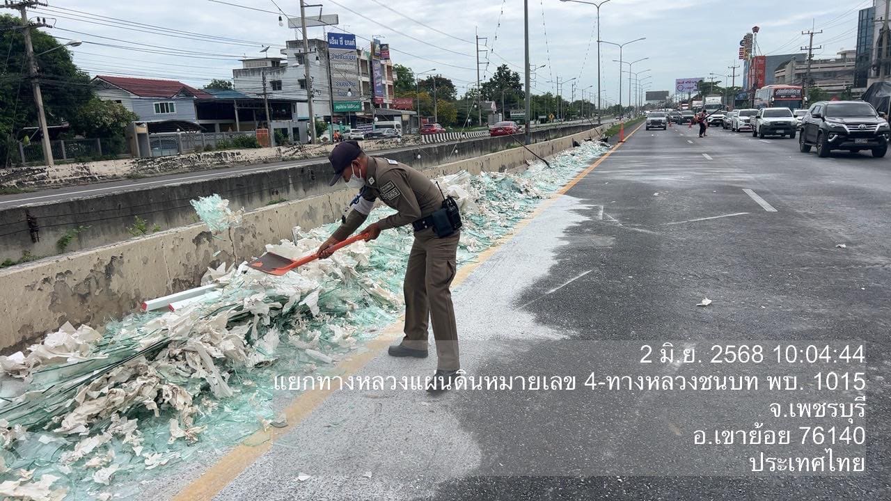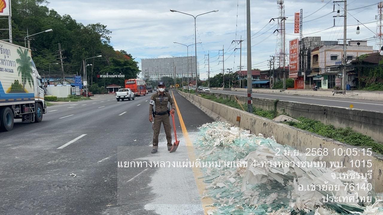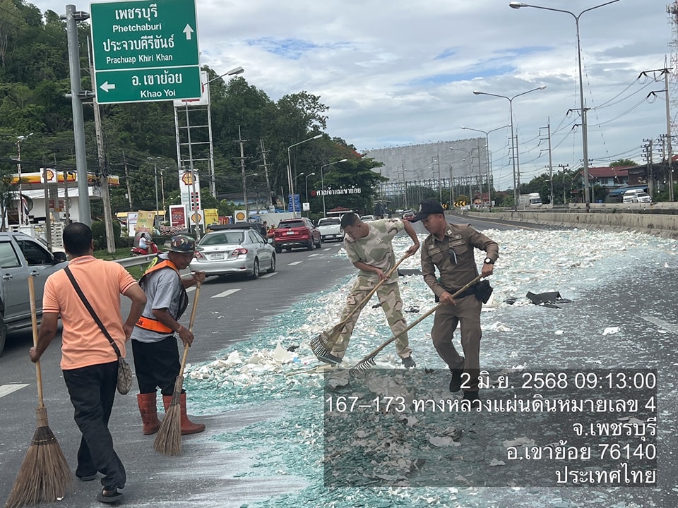 วันที่ 2 มิ.ย. 2568 เวลา 08.56 น. ศูนย์รับแจ้งเหตุ ฉุกเฉิน 191 เพชรบุรี ได้รับแจ้งมีเหตุปัญหาจราจร รถบรรทุกทำกระจกตกหล่นบนถนน บริเวณแยกเขาย้อย ถ.เพชรเกษม ขาล่องใต้ จึงได้สั่งการ สภ.เขาย้อย ให้ สายตรวจเขาย้อย 60 ตรวจสอบและประสานเจ้าหน้าที่กรมทางฯ มาทำความสะอาดและเก็บกวาดเศษกระจกต่อไป