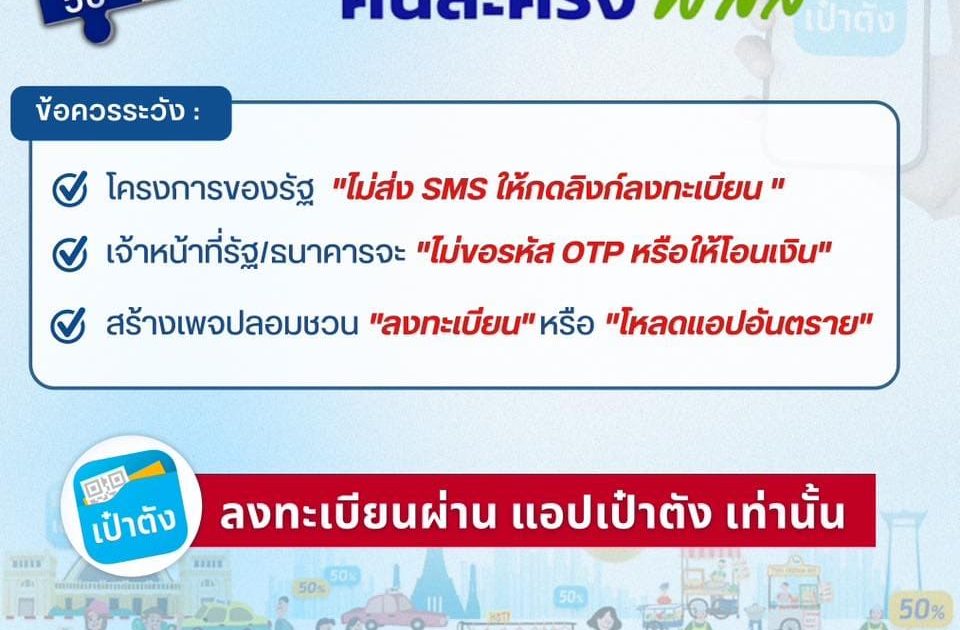– การลงทะเบียนที่ถูกต้องทำได้เฉพาะแอป “เป๋าตัง” และ “ถุงเงิน”