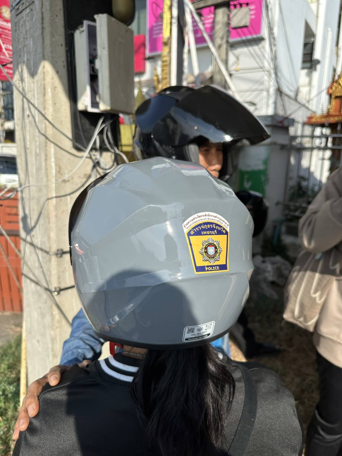พบผู้ที่ขับขี่รถจยย.ไม่สวมหมวกนิรภัยจึงได้อบรมจราจร และมอบหมวกกันน็อค ตามโครงการจิตอาสาจราจร ภ.จว.เพชรบุรี