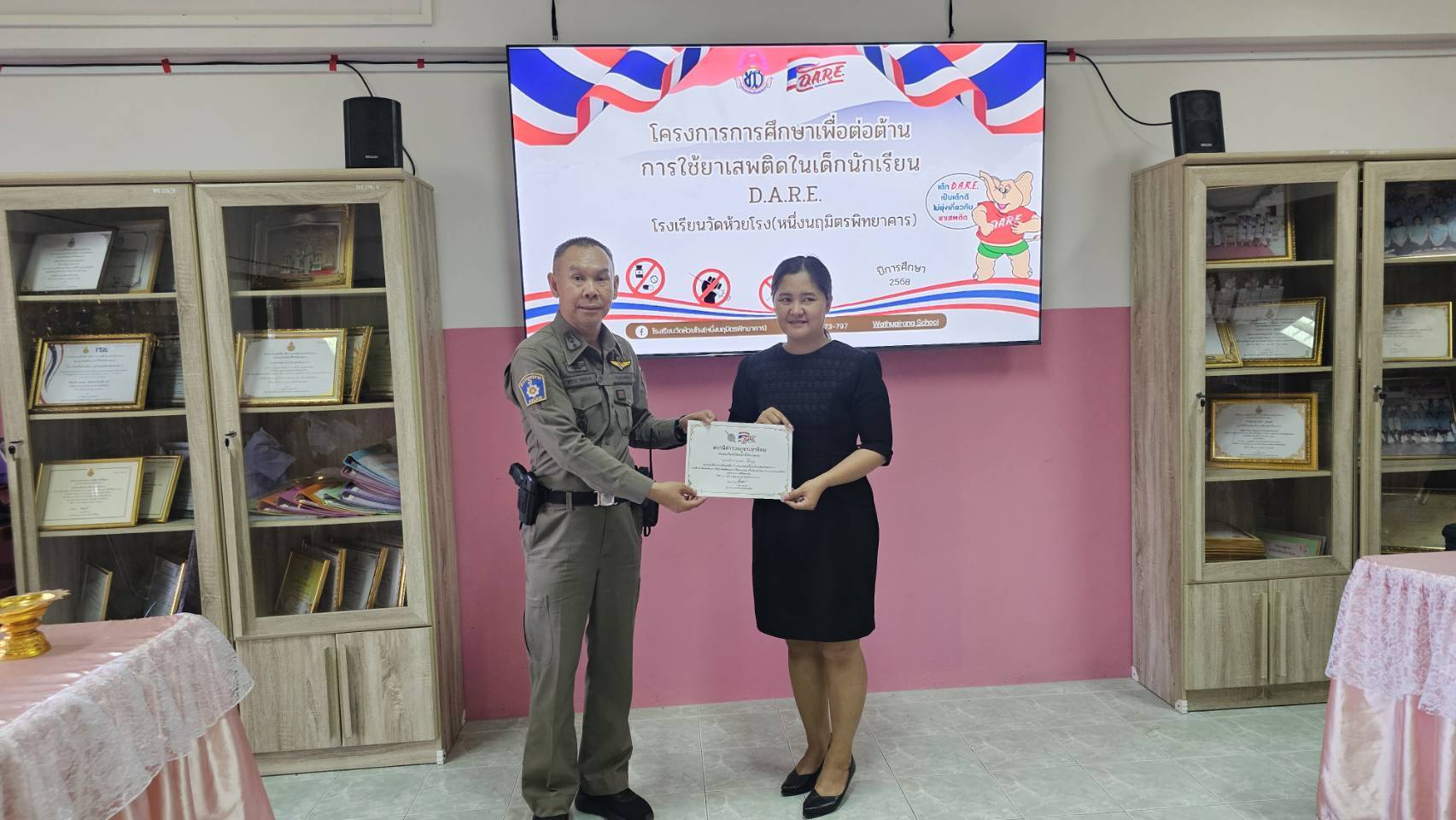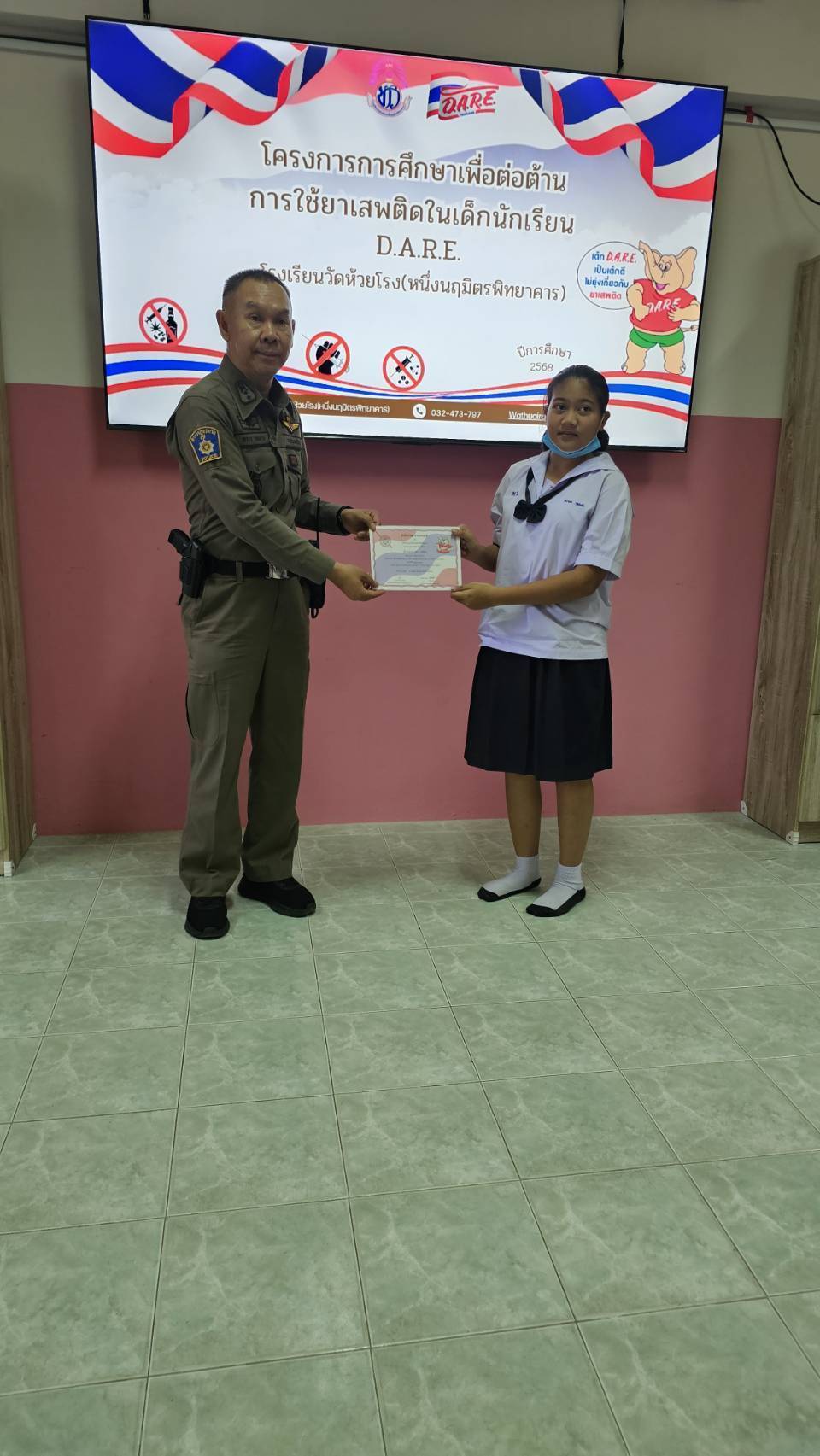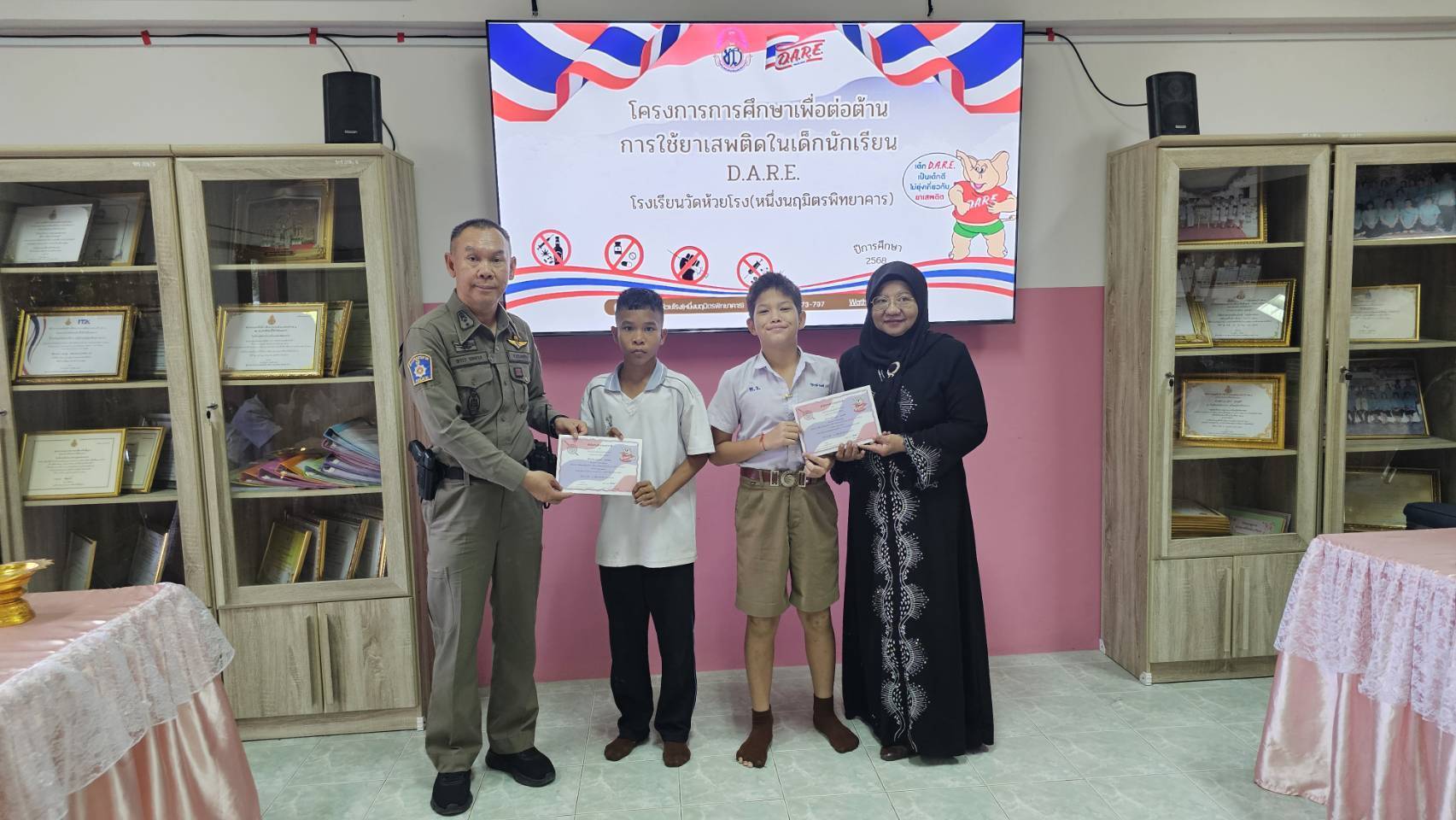 ว.4 โครงการ Stop Walk Talk กับ นางสาวละเมียด ไทยแท้ ผู้อำนวยการโรงเรียนวัดห้วยโรง และมอบใบประกาศ D.A.R.E.ให้กับเด็กนักเรียน เกี่ยวกับการป้องกันยาเสพติด ความปลอดภัยสวัสดิภาพของนักเรียน และการป้องกันอาชญากรรมทางไซเบอร์ กับทางโรงเรียน