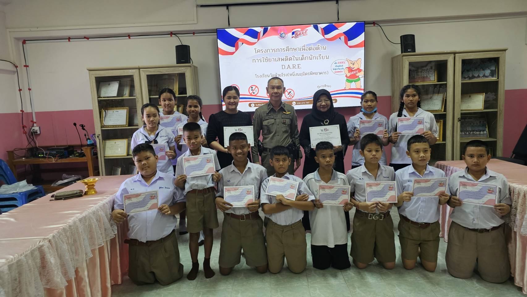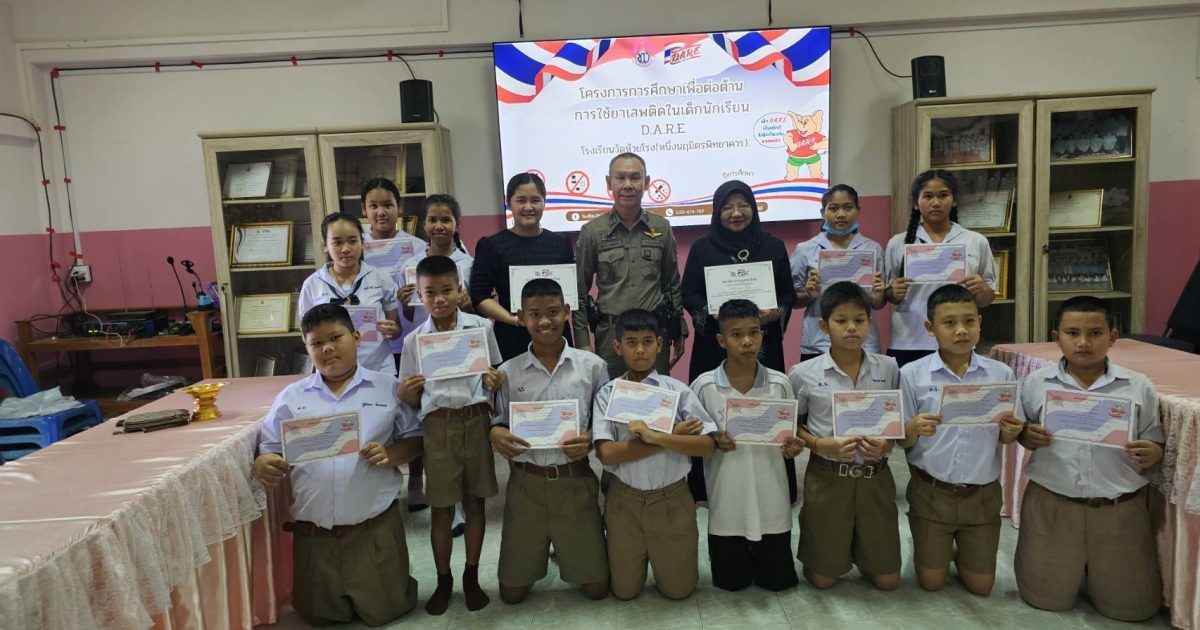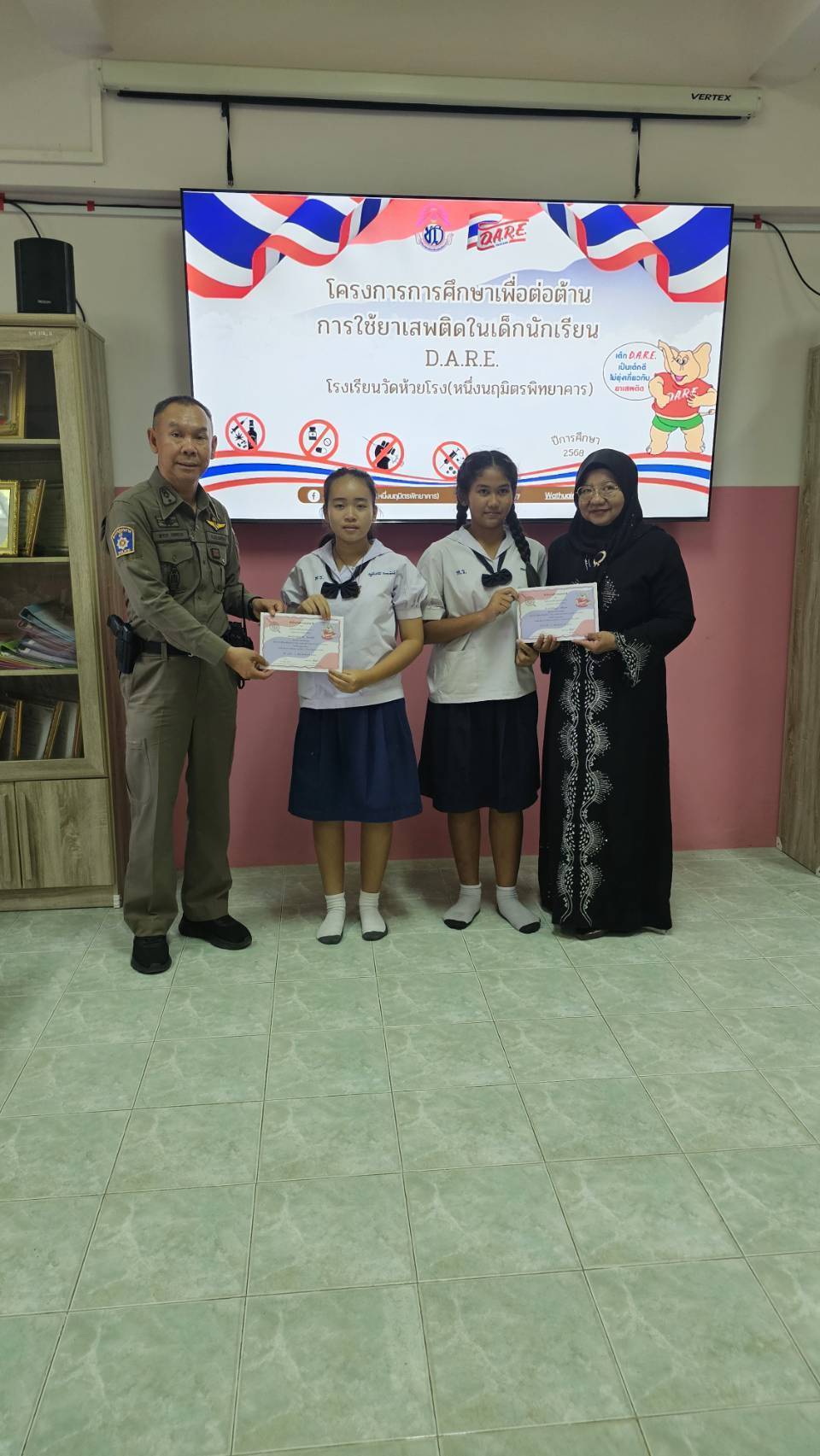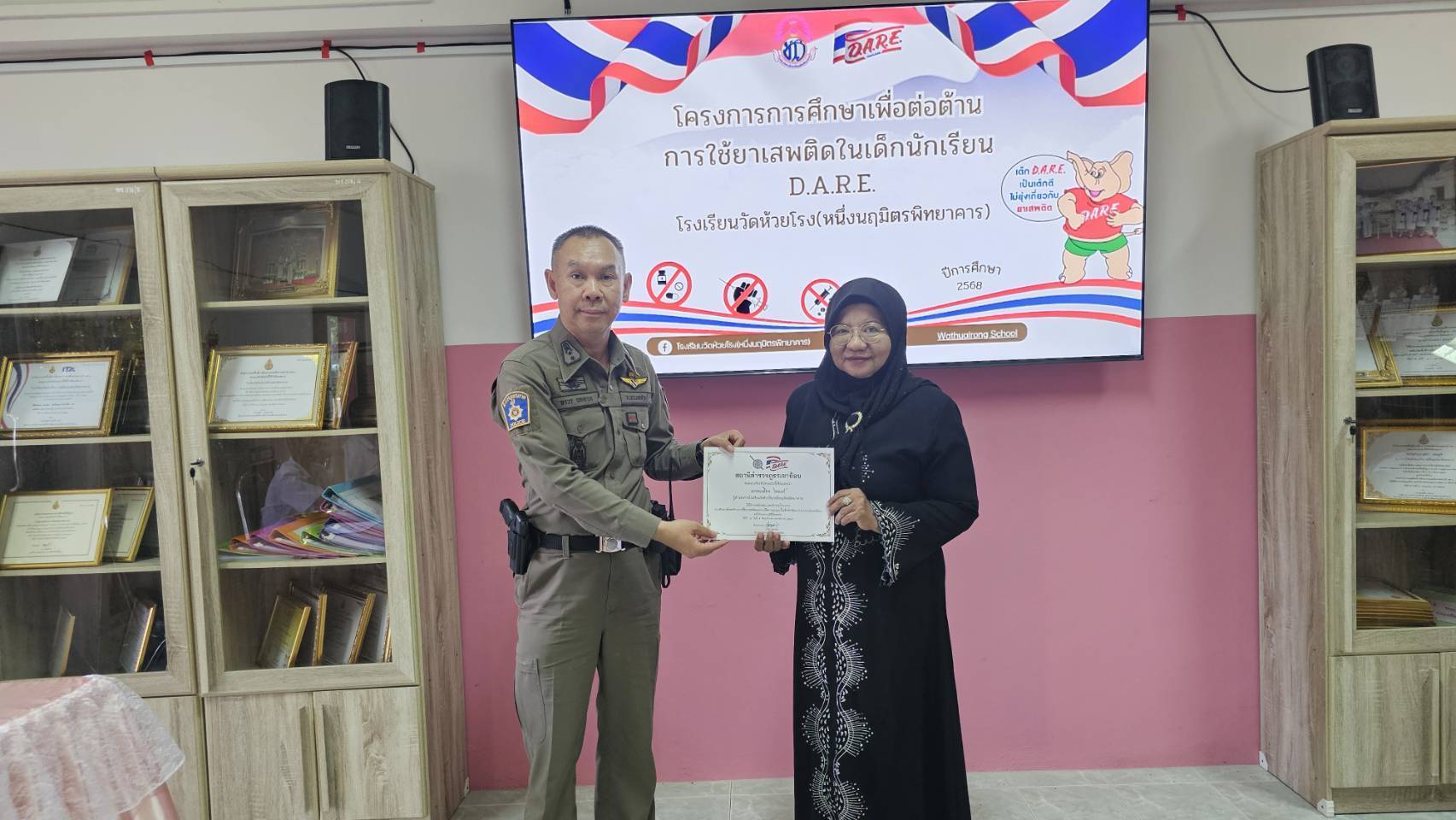 ว.4 โครงการ Stop Walk Talk กับ นางสาวละเมียด ไทยแท้ ผู้อำนวยการโรงเรียนวัดห้วยโรง และมอบใบประกาศ D.A.R.E.ให้กับเด็กนักเรียน เกี่ยวกับการป้องกันยาเสพติด ความปลอดภัยสวัสดิภาพของนักเรียน และการป้องกันอาชญากรรมทางไซเบอร์ กับทางโรงเรียน