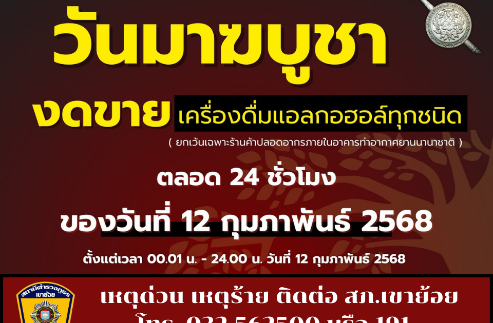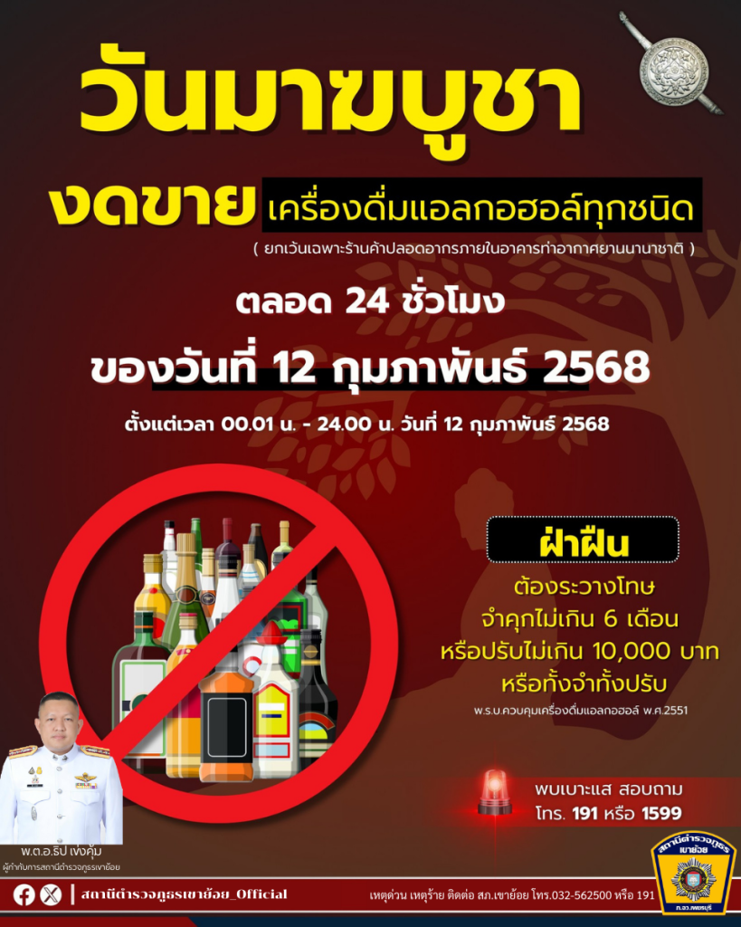 ❌งดขายเครื่องดื่มแอลกอฮอล์ในวันมาฆบูชา 11 กุมภาพันธ์ 2568 โดย adm_khaoyoi adm_khaoyoi / ข่าวประชาสัมพันธ์,งานป้องกันปราบปราม โดยภายใต้การอำนวยการของ พ.ต.อ.ธิป เข่งคุ้ม ผกก.สภ.เขาย้อย ได้สนองนโยบายของทาง สำนักงานตำรวจแห่งชาติงดขายเครื่องดื่มแอลกอฮอล์ในวันมาฆบูชาตำรวจพร้อมเข้มงวดดูแลความปลอดภัยประชาชนโดยเฉพาะศาสนสถานทั่วประเทศพร้อมทั้งขอความร่วมมือไปยังพี่น้องประชาชนช่วยกันสอดส่องดูแล หากต้องการความช่วยเหลือ หรือพบเห็นการกระทำความผิด สามารถแจ้งได้ทางสายด่วน 191 และ 1599 ตลอด 24 ชั่วโมง#มาฆบูชา#วันมาฆบูชา#สำนักงานตำรวจแห่งชาติ#Royalthaipolice
