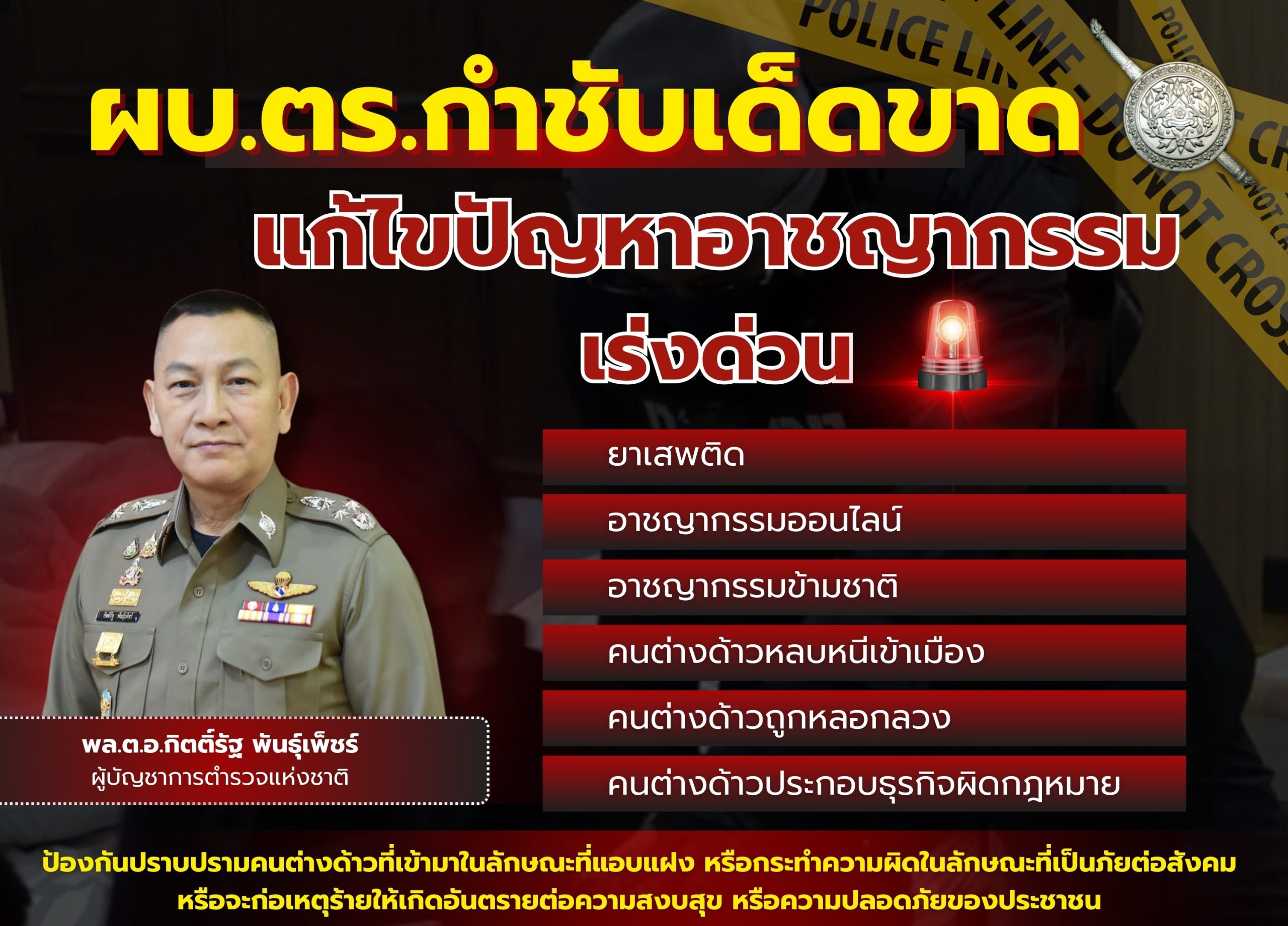 ผบ.ตร. กำชับ ตามที่ รัฐบาล และ ตร. มีนโยบายเร่งด่วนในการแก้ไขปัญหายาเสพติด ปัญหาอาชญากรรมออนไลน์ อาช